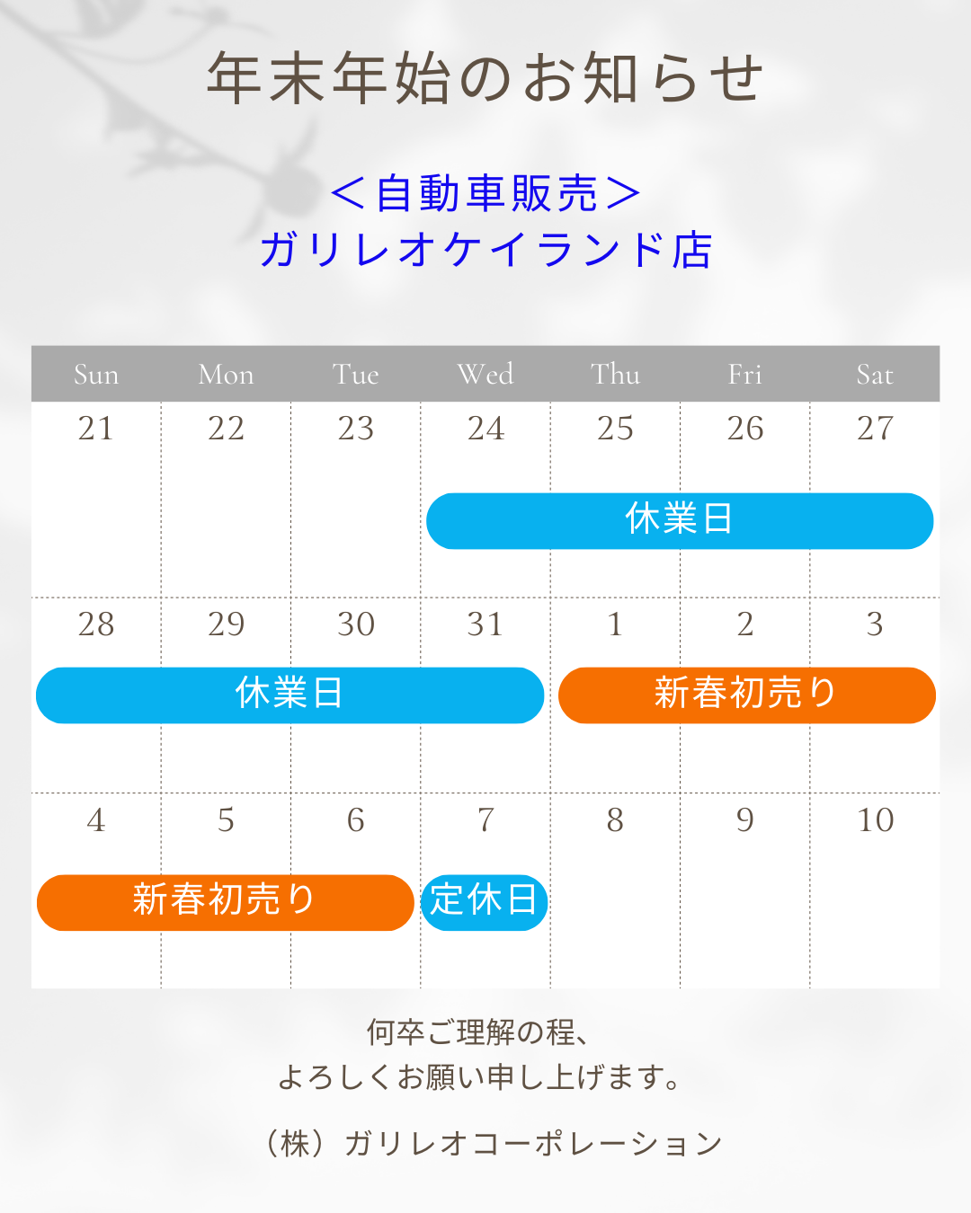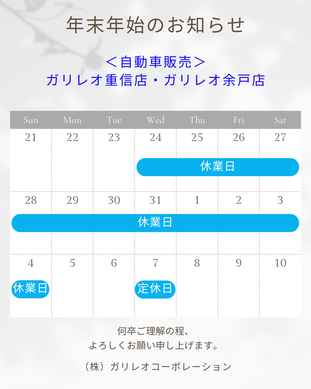 ガリレオ重信店(自動車販売)につきましては12/24(水)~1/4(日)までお休みさせていただきます。